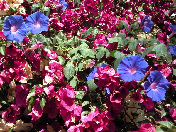 In a combination which this northerner found unlikely (and accordingly so very spectacular), these bougainvillea and morning glories were entwined on the side of the drive to the Charles Eames house in Pacific Palisades this afternoon.