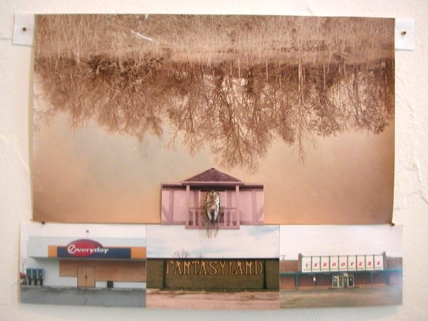 These are two mixed-medium works by Bryan Zimmerman currently installed in the show, "Begging a Proper Donnybrook," at Archibald Arts. The image at the top is a detail.
