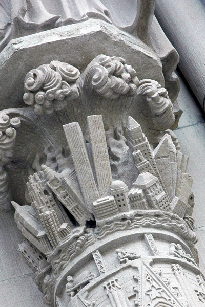 Each time I head uptown for something going on at the Episcopal Cathedral Church of Saint John the Divine, almost always with friends who haven't been there before, I look for this capital above one of the massed columns surrounding one of the formal entrances on the West Front. I had come to assume that almost everyone had probably heard about this treasure, and its various companions, but after a look around Google-land just now, I found that they may not be as well known or photographed as I had thought.