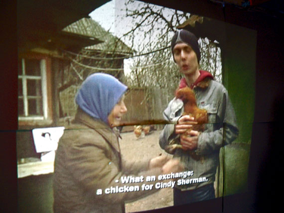 In SOSka's video Barter (2007) the artists arrive at a local village and set up a display of artistic reproductions by Chuck Close, Cindy Sherman and others in hopes of trading them for food with the local farmers. While the video offers a playful glimpse into the perceived value of art, it also provides a telling social commentary about conditions in post-soviet Ukraine from the point of view of those who are insulated from the geo-politics of the western cannons and from the contemporary art world, including the artists themselves. The video will be accompanied by a series of photographs that document of the farmers posing with their selections and interior shots of where and how they have chosen to display these works in their homes.