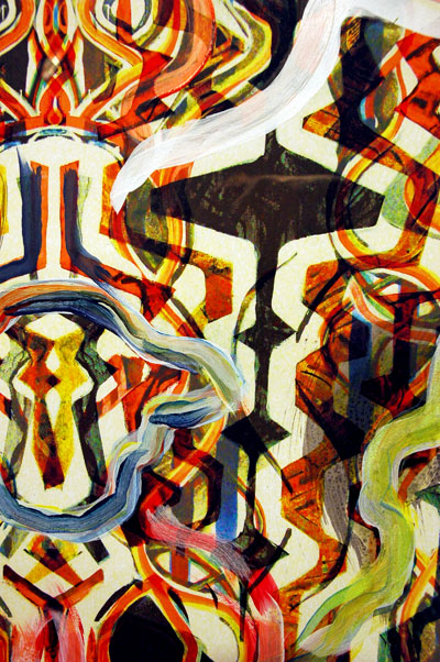 Michael Maxwell Self-portrait in another dimension 2009 saffron, poppy, indigo, lapis and other natural pigments, crushed quartz crystal, silver leaf and crylic on giclee print 67" x 45" framed [detail]