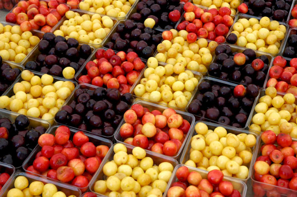 This image includes only one segment of a vast checkered display set up in the Union Square Greenmarket last Friday by Samascott Orchards, of Martin van Buren's Kinderhook, New York. The cherries were going fast.
