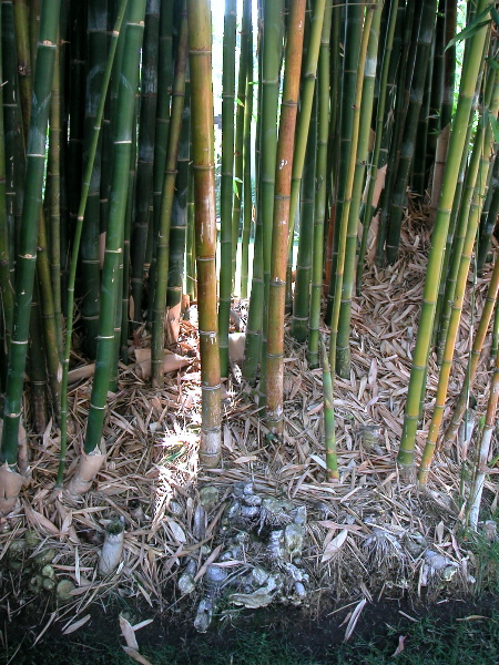 Schindler House, view at the driveway entrance of part of a very tall and dense copse of bamboo which runs along the front sidewalk (the pleasant sounds of a large, creaking wooden ship are heard when the wind blows)