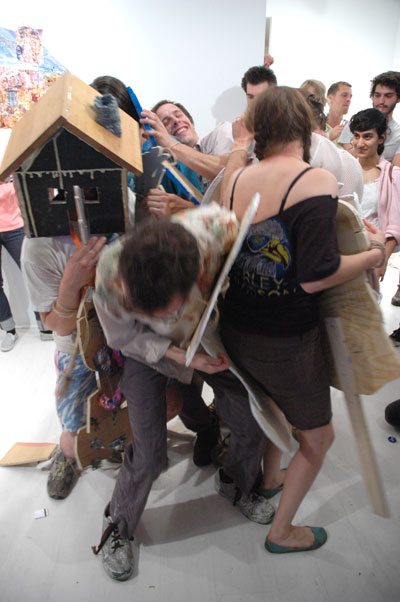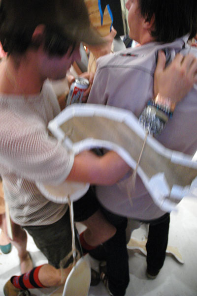 Jacques Louis Vidal's appearance at Sunday is more than a show; it's a way of art, a two-way street for both the artist and the viewer. At the opening reception of "Wood Folks is Good Folks" the artist enlisted himself and some half dozen volunteers in a performance which literally wound through (and into) the entire gallery installation. He's promised one more performance for this Saturday, July 7, a workshop called "making friends + keeping friends". It should start soon after the mesquite cookout, which is on the schedule from 1 to 4. I definitely recommend a visit to Eldridge Street that day.
