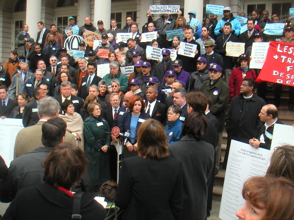 In addition to these faces, those who attended the hearing itself yesterday saw, sitting as supportive members of the Councilmembers Yassky, Clarke, Stewart, Katz, Liu and Gerson. Testifying were some of the figures on the steps earlier as well as Cynthia Goldstein of the San Francisco Human Rights Commisison, Brian McLaughlin of the AFL/CIO, and a number of others.