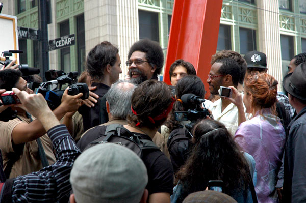 Once again we happened to have picked a pretty quiet moment, the police who surround them being content for a time with sequestering their superior numbers and sheathing their brute strength. Of course there was also the implied violence of that monstrous elevated surveillance tower overhead. But people inside the park were not all idle. While some rested or were in engaged in discussions, others were talking to pedestrians who had stopped to learn what was going on. Some were being interviewed by the press, and throughout the hour or so we were there a large group was seriously engaged in the process of an extraordinarily open and democratic "general assembly".