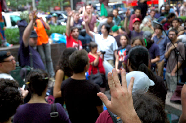 The volume of ambient sound found in Liberty Plaza makes it impossible to hear anyone at any distance, and certainly impossible to carry on a conversation in a reasonable-sized group. In order to be able to conduct any kind of assembly the group had had to improvise a system which required more than just a facilitator. A number of hand and arm signals were established; they represented the simplest and most common moves or requests which might be expected from the "floor" (like 'point of order'). Also, because they wanted to keep the noise down (yeah), people were asked, should they want to approve or applaud what they heard, to raise their arms and "jazz hands". Most remarkably, there were also a number of "repeaters" positioned at some reasonable distance from the speakers who were asked to speak from a designated area in the front of the assembly. The repeaters' assignment was to dutifully repeat in unison each phrase uttered by the speaker, who for that to work would have to regularly break up her or his address, thus facilitating its broadcast to the larger group.
